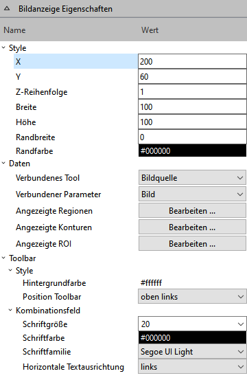 Über das Eigenschaften-Panel haben Sie Zugriff auf die Eigenschaften der einzelnen Widgets. Sie können Einstellungen zur Darstellung und Steuerung der Elemente vornehmen und Verbindungen zum MERLIC Creator herstellen. Einige Widgets können mit Tools vom MERLIC Creator verbunden werden und die jeweiligen Toolparameterwerte oder Ergebnisse abfragen. Bei einigen Elementen lassen sich die Parameterwerte sogar direkt im Frontend anpassen. Die verfügbaren Eigenschaften hängen vom jeweiligen Widget ab.
