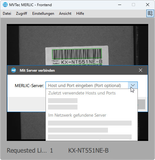 Um eine Remote-Verbindung herzustellen, müssen Sie den MERLIC-Server angeben, zu dem das Frontend eine Verbindung herstellen soll, d. h. den Hostnamen oder die IP-Adresse des MERLIC-Servers und den Port, der verwendet werden soll. Ein MERLIC-Server ist Teil des MERLIC-Kerns Die Verarbeitungseinheit einer aktiven MERLIC-Vision-App., der auf dem Hostrechner gestartet wurde.