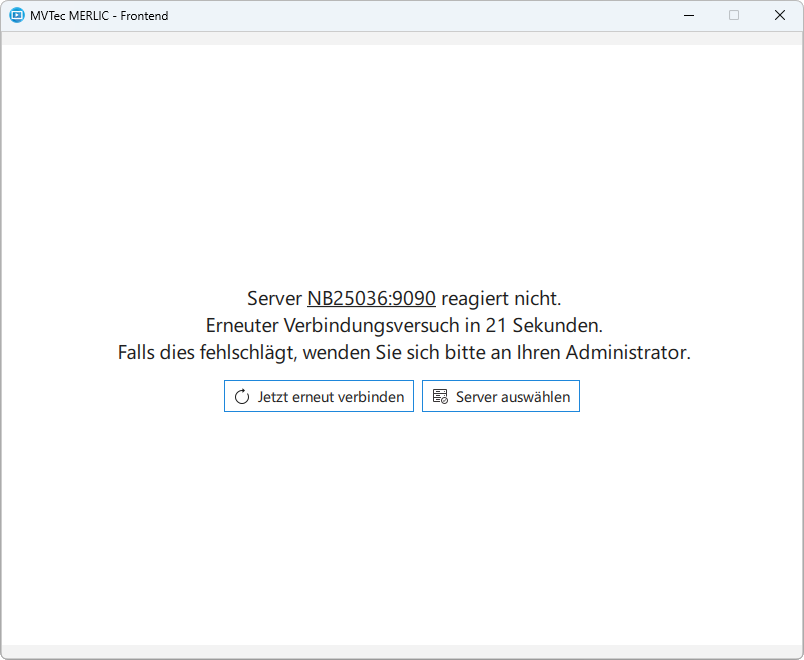 In einigen Fällen kann die Verbindung zum ausgewählten MERLIC-Server unterbrochen werden, sodass das Frontend der entsprechenden MERLIC-Vision-App nicht mehr verfügbar ist. Um die Verbindung zum Server wiederherzustellen, stellen Sie bitte sicher, dass alle Voraussetzungen erfüllt sind, und versuchen Sie erneut, eine Verbindung herzustellen. Sie können entweder versuchen, die Verbindung zum vorherigen Server mit „Jetzt erneut verbinden“ wiederherzustellen, oder Sie können über die Schaltfläche „Server auswählen“ einen anderen Server auswählen.