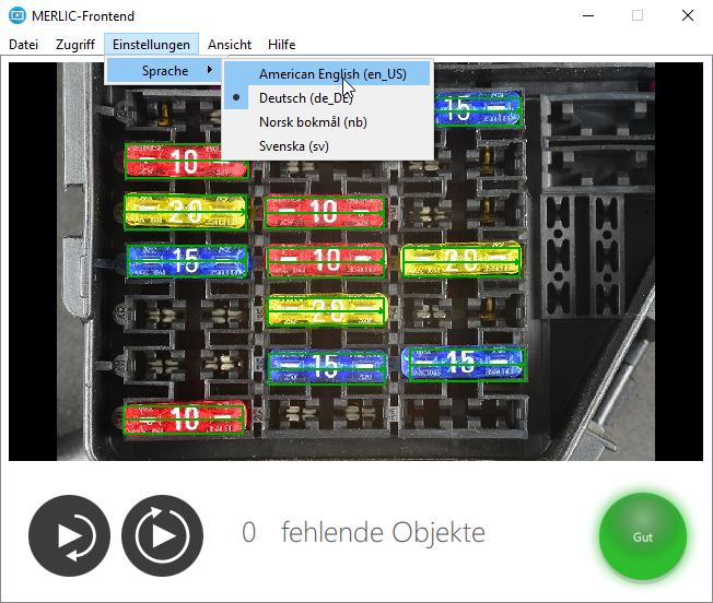Eine Voraussetzung zum Ändern der Sprache ist, dass die Spracheinstellungen für das MERLIC Frontend beim Entwurf des Frontends der MERLIC-Vision-App entsprechend angepasst wurden. Diese Spracheinstellungen bieten auch die Möglichkeit, die Standardsprache zu ändern, in der das MERLIC Frontend geöffnet wird. Die Standardsprache gilt für alle MERLIC Frontends (auch wenn sie über eine Remote-Verbindung geöffnet wurden), d. h., die Standardsprache ist unabhängig von den Anwendungen. Die festgelegte Standardsprache wird also in den MERLIC-Einstellungen gespeichert und nicht in der MERLIC-Vision-App.