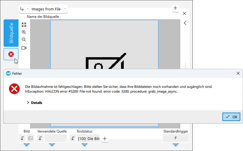 Falls die Bildquelle in der aktiven Konfiguration fehlt, wird die MVApp jedoch ausgeführt, obwohl kein Bild eingezogen werden konnte. Stattdessen gibt das Tool „Bildquelle“ ein Fehlerbild aus, das an die verbundenen Tools weitergeleitet wird. Kann die Bildverarbeitungsaufgabe in den nachfolgenden Tools ohne Fehler durchgeführt werden, kann es einige Zeit dauern, bis das Problem erkannt wird. Der jeweilige Fehler wird im Ergebnis „Toolstatus“ des Tools „Bildquelle“ ausgegeben.