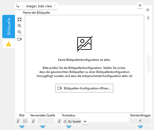 In der folgenden Abbildung ist beispielsweise keine Bildquellen-Konfiguration aktiv. Daher konnte kein Bild von der ausgewählten Bildquelle eingezogen werden. In diesem Fall wird im Toolboard eine Meldung mit einem Hinweis auf die Ursache des Problems angezeigt. Darüber hinaus wird über das Warnsymbol und den Wert des Ergebnisses „Toolstatus“ eine Warnung für das Tool gemeldet. Um ein derartiges Problem zu beheben, können Sie die Bildquellen-Konfiguration über die im Toolboard verfügbare Schaltfläche öffnen, die Konfiguration der Bildquellen überprüfen und die erforderlichen Anpassungen vornehmen.