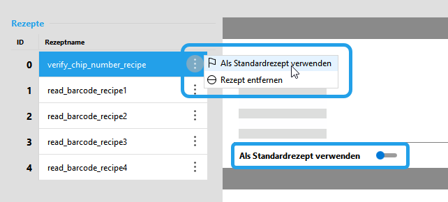 - Wählen Sie das Rezept, das Sie als Standardrezept festlegen möchten, in der Liste der Rezepte aus.