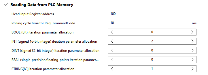 Dieser Parameter definiert die Anzahl von INT-Ergebnissen, die an die SPS übertragen werden können. Wenn Sie beispielsweise bis zu fünf INT-Ergebnisse übertragen möchten, müssen Sie den Parameter auf 5 oder höher festlegen.