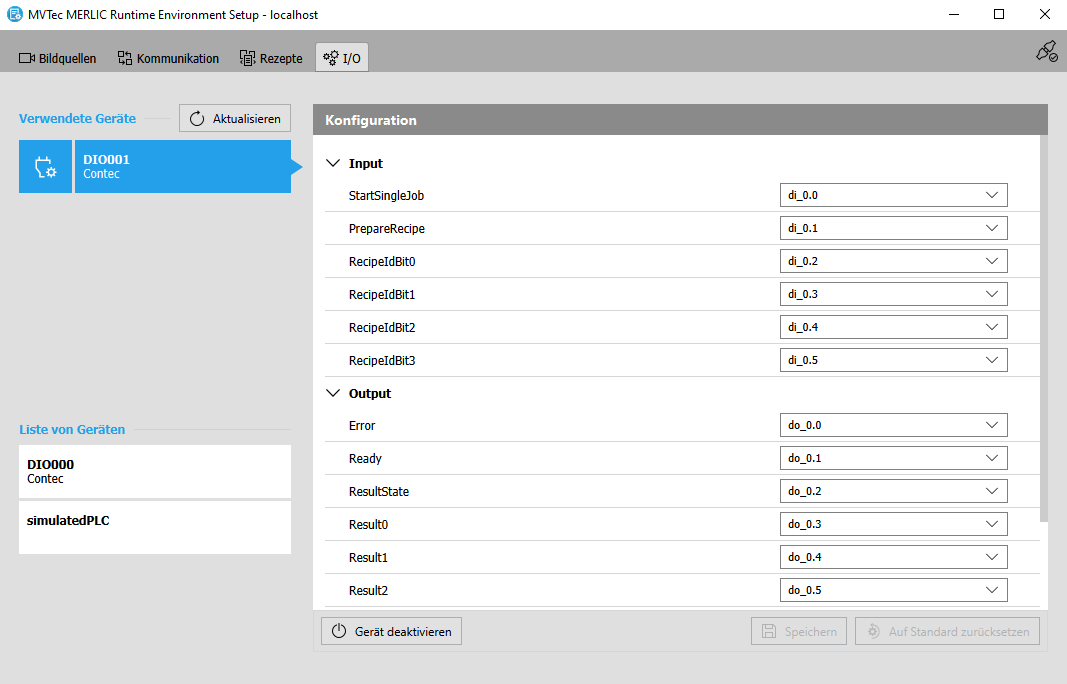 Die Konfiguration von digitalen I/O-Geräten und Kamerageräten mit I/O-Kanälen erfolgt weitgehend ähnlich und kann nur auf der Registerkarte „I/O“ des MERLIC RTE Setups durchgeführt werden. Bei Hilscher-Karten werden die Hauptkonfigurationsschritte vorher mit einer externen Konfigurationssoftware von Hilscher durchgeführt. Die Registerkarte „I/O“ stellt den letzten Konfigurationsschritt für Hilscher-Karten dar. Weitere Informationen finden Sie unter Hilscher PCI-Karte.