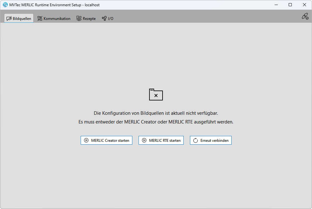 Wenn Sie mit dem lokalen System verbunden sind und die Verbindung zum Konfigurationsdienst für die Registerkarte „Bildquellen“ getrennt wurde, können Sie den MERLIC Creator bzw. MERLIC RTE im MERLIC RTE Setup bequem über die entsprechenden Schaltflächen neu starten. Wenn Sie die Anwendungen außerhalb des MERLIC RTE Setups gestartet haben, z. B. über das Windows-Startmenü, können Sie die Verbindung zum jeweiligen Konfigurationsdienst auch über die Schaltfläche „Erneut verbinden“ wiederherstellen. Dies ist ebenfalls notwendig, wenn Sie mit einem Remote-System verbunden sind, weil Sie zuerst den MERLIC Creator oder MERLIC RTE auf dem Remote-System starten müssen, damit die Verbindung zum Konfigurationsdienst über die Schaltfläche „Erneut verbinden“ wiederhergestellt werden kann. Allerdings gehen alle nicht gespeicherten Änderungen der Bildquellen-Konfiguration verloren, wenn die Verbindung zum Konfigurationsdienst getrennt wird.