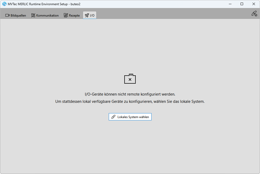 Auf Remote-Systemen können Sie Bildquellen und Kommunikations-Plugins konfigurieren. Die Konfiguration von MERLIC-Rezepten und Geräten, für die MERLIC integrierte I/O-Plugins bereitstellt, z. B. digitale I/O-Geräte, ist jedoch nicht möglich.