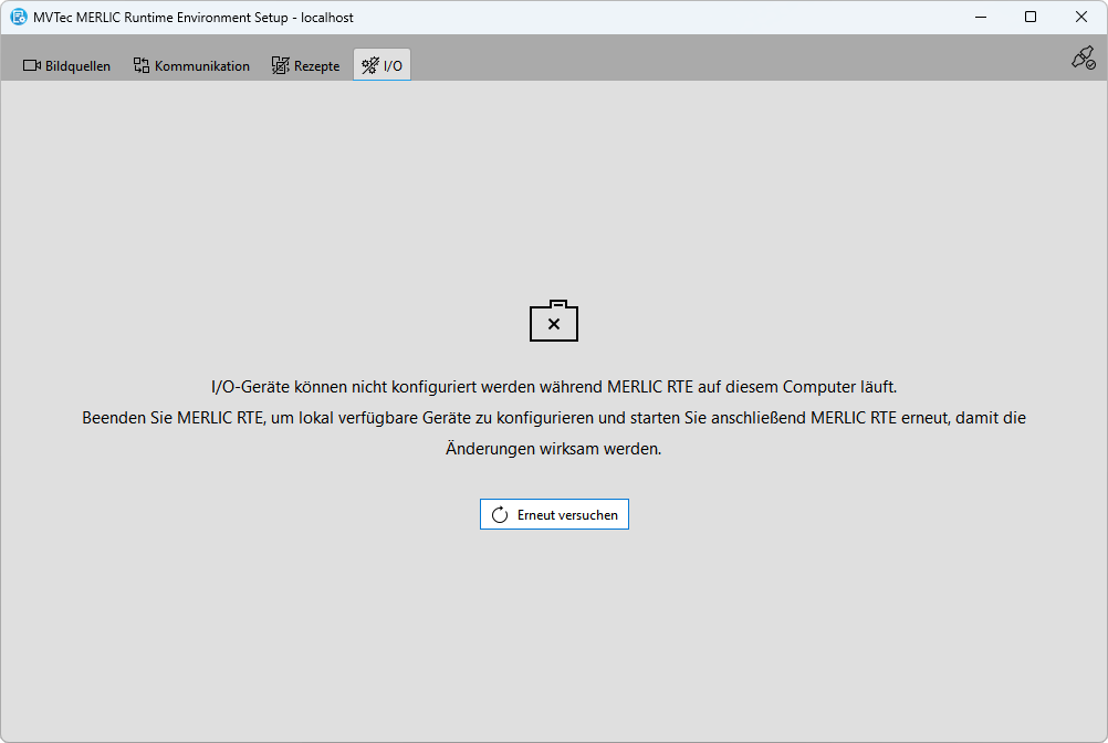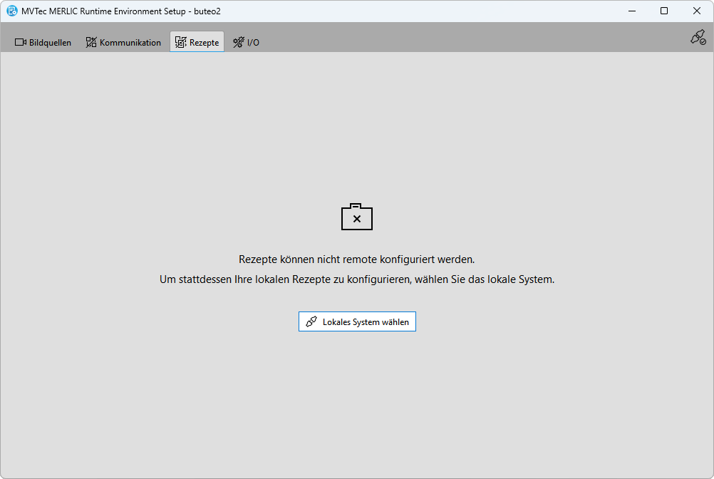 Auf dem lokalen System können alle Konfigurationsoptionen des MERLIC RTE Setups verwendet werden. Sie können Bildquellen für den Bildeinzug konfigurieren, Rezeptdateien verwalten sowie alle I/O-Plugins und Kommunikations-Plugins konfigurieren, die auf dem lokalen System verfügbar sind.