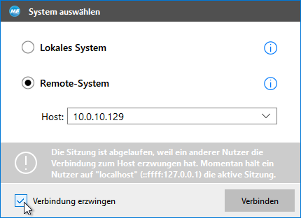 Wenn ein anderer Benutzer eine Verbindung zu dem System erzwingt, mit dem Sie derzeit verbunden sind, wird Ihre Sitzung beendet, sodass die Konfiguration nicht fortgesetzt werden kann. Alle nicht gespeicherten Änderungen gehen verloren. In diesem Fall wird das Dialogfeld „System auswählen“ mit einer entsprechenden Meldung angezeigt. Sie haben die Möglichkeit, eine Verbindung zum jeweiligen System zu erzwingen, indem Sie das Kontrollkästchen „Verbindung erzwingen“ aktivieren und auf „Verbinden“ klicken. Der Benutzer, der zuvor verbunden war, erhält dann ebenfalls die Meldung, dass die Sitzung des Benutzers abgelaufen ist.