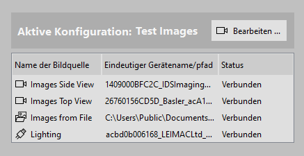 Wenn Sie überprüfen möchten, welche Bildquellen derzeit in Ihrer MVApp verfügbar sind, können Sie den aktuellen Zustand im MERLIC Creator-Panel „Bildquellen-Konfiguration“ ermitteln. Im Panel werden die aktive Konfiguration sowie eine Übersicht über alle Bildquellen in der betreffenden Konfiguration angezeigt.