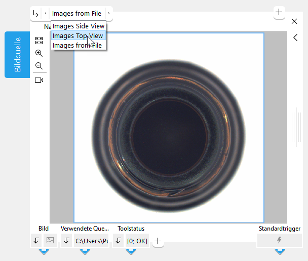 Ausgewählt werden können lediglich Bildquellen der derzeit aktiven Bildquellen-Konfiguration. Beachten Sie außerdem, dass das Tool „Bildquelle“ für den Abruf von Bildern vorgesehen ist, die vom Image Source Manager eingezogen wurden. Bildquellen, die mit der Option, keine Bilder einzuziehen, hinzugefügt wurden, z. B. Beleuchtungsregler, können daher im Tool nicht ausgewählt werden.