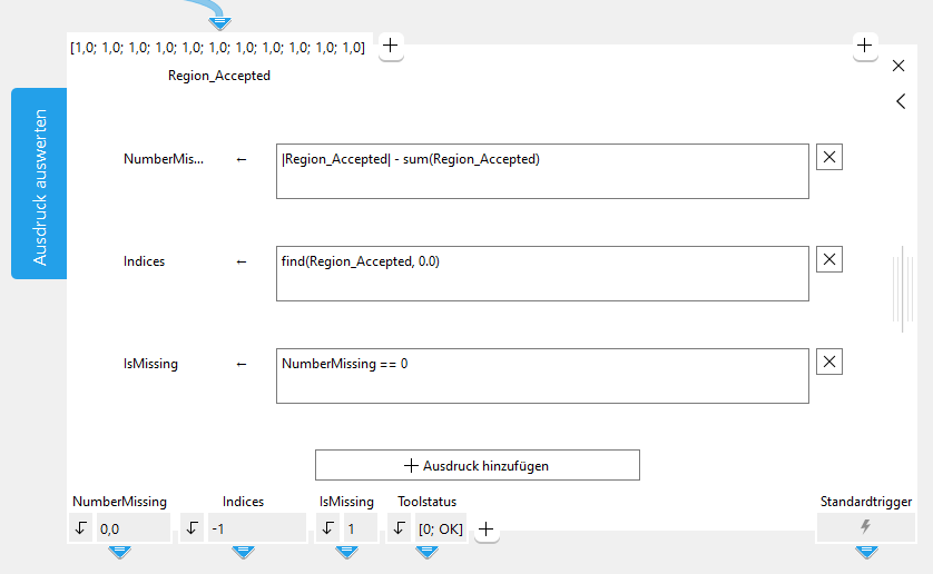 Die Ausdrücke, die ausgewertet werden sollen, müssen im Eingabefeld des Toolboards definiert werden. Wenn noch kein Ausdruck oder ein ungültiger Ausdruck definiert wurde, zeigt MERLIC einen Fehler im Toolboard und im Tool-Flow-Panel an. Dieser Fehler wird jedoch nur angezeigt, weil der Ausdruck fehlt oder falsch ist. Es weist nicht auf einen schwerwiegenden Fehler im Arbeitsbereich hin. Daher gibt das Ergebnis „Toolstatus“ in diesem Fall weiterhin „[0; OK]“ aus.