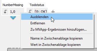 Sie können Ergebnisse auch ausblenden, beispielsweise wenn es Zwischenergebnisse gibt, die mit keinem anderen Tool verbunden sind und lediglich in einem nachfolgenden Ausdruck im Tool-Flow verwendet werden. Klicken Sie mit der rechten Maustaste auf das Ergebnis, das Sie ausblenden möchten, und wählen Sie „Ausblenden“ aus. Klicken Sie auf die Schaltfläche rechts neben den Ergebnissen, um ein ausgeblendetes Ergebnis anzuzeigen.