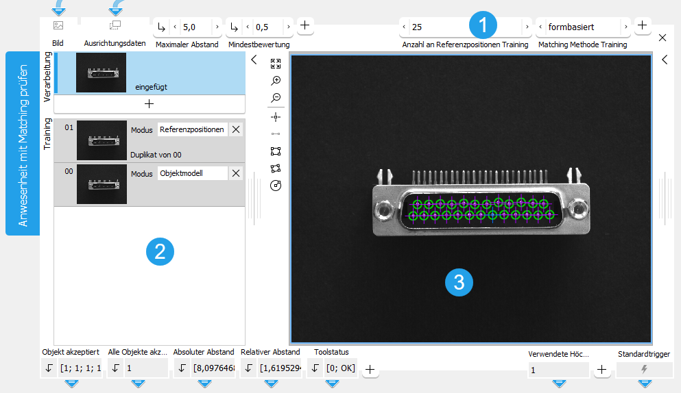 - Wechseln Sie zum Trainingsbild für den Modus „Referenzpositionen“, um die jeweiligen Referenzpositionen zu definieren, an denen das Referenzobjekt erwartet wird. Das Tool hebt mögliche Objekte im Trainingsbild hervor, die zum Referenzobjekt passen.