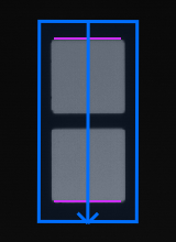Die Kanten können sich in beiden Richtungen ändern, d. h. von dunkel nach hell oder von hell nach dunkel. Die ersten gefundenen Kanten werden unabhängig vom jeweils vorhandenen „Kantenübergang“ für das gegenüberliegende Kantenpaar verwendet. Das Bild auf der rechten Seite zeigt das Kantenpaar, das in einer ROI gefunden wird, wenn der Parameter auf „beliebig“ eingestellt wird. Da die Richtung der ROI von oben nach unten verläuft, erfolgt die Suche im Bild nach einer Kante in der ROI von oben nach unten. Die Suche der anderen Kante erfolgt von unten nach oben. In diesem Beispiel weist die erste bei der Suche von oben nach unten gefundene Kante den Übergang „dunkel auf hell“ auf, während die gegenüberliegende Kante, die in der Richtung von unten nach oben gefunden wurde, den Übergang „hell auf dunkel“ aufweist. |