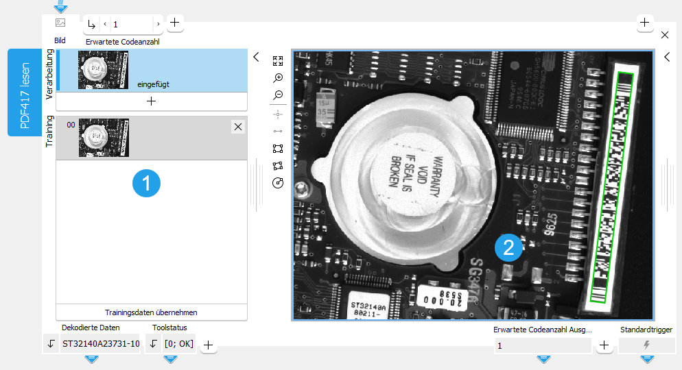 - Klicken Sie auf die Schaltfläche „Trainingsdaten übernehmen“, um das Training zu starten. Die Parameter für die Trainingsbilder werden automatisch bestimmt. Das Tool wechselt darüber hinaus automatisch in den Verarbeitungsmodus und zeigt die erkannten Codes im aktuellen Bild an.