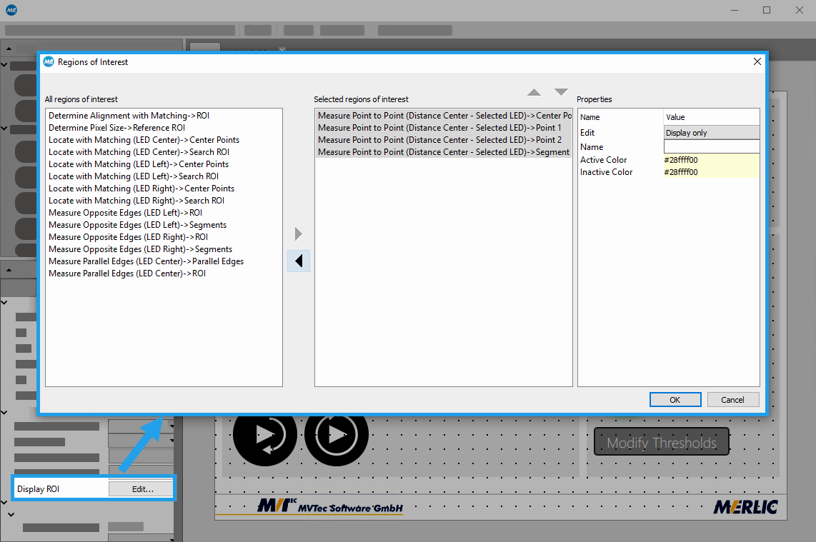 - Click on the "Edit..." button of the widget property you want to edit, e.g., "Display ROI". A new dialog opens that contains a list of all available iconic parameters and results on the left side.