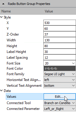 - Insert the widget "Combo Box" or "Radio Button Group" into the workspace. The corresponding properties of the widget are instantly displayed in the properties panel.