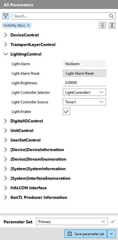 • Filter the parameter list to show only specific parameters instead of all of them, for example, to show only persistent parameters. The available filter options are the same as those for filtering parameters of a camera device. For more information, see the section Filtering the Camera Parameters in the topic Adjusting Camera Parameters.