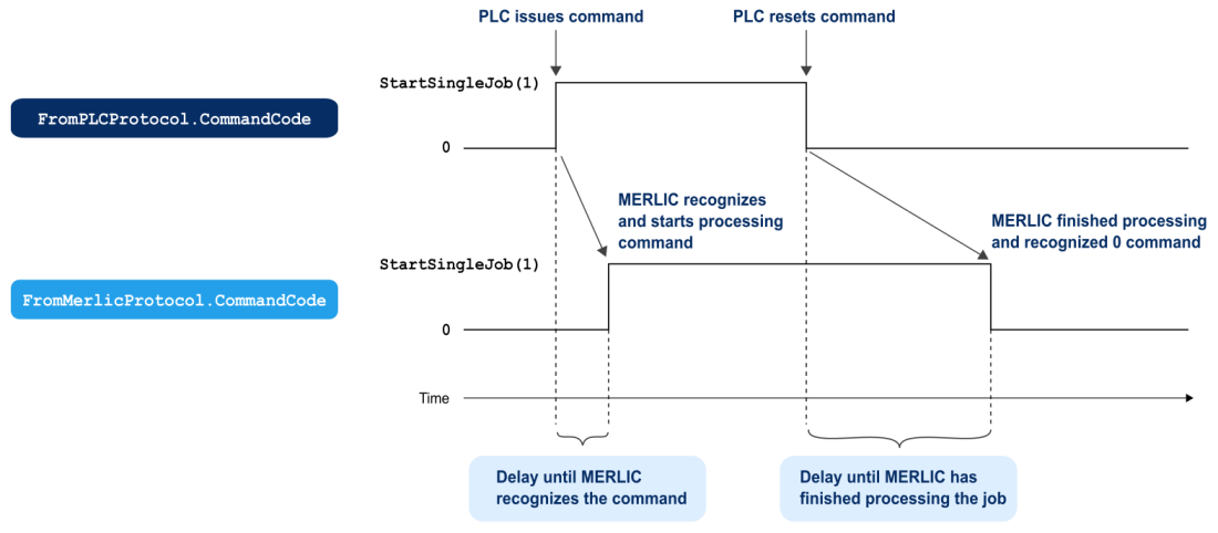 The following graphic shows the handshaking process for the command "StartSingleJob". The PLC triggers a single execution by setting CommandCode in the protocol FromPLCProtocol to 1. When MERLIC recognized the command, the CommandCode member in the protocol FromMerlicProtocol is also set to 1 as confirmation for the PLC, and MERLIC starts to execute the MVApp in a single iteration. As soon as the PLC receives the confirmation from MERLIC that the command was recognized, the CommandCode member in FromPLCProtocol is set to 0 to finalize the handshaking process. After finishing the single iteration of the MVApp, MERLIC checks which CommandCode is sent from the PLC and proceeds accordingly.