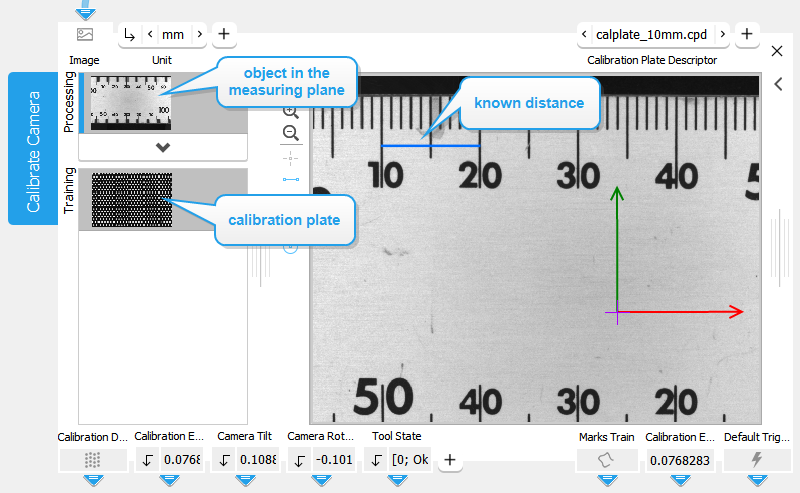 The calibration data can then be used in subsequent tools, i.e., to rectify the image with Rectify Image. Furthermore, this tool enables you to use a region of interest (ROI) to define a known length in an image and therefore specify the pixel size at a certain distance to the camera. This tool only calibrates in one measurement plane. By using an ROI you can define a reference length for objects that are parallel to the calibration plate but on a different level.