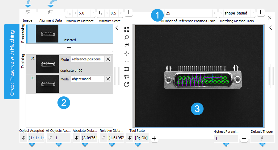 The tool provides a training area on the left side of the Tool Board. It enables you to switch between the processing mode for the search and the training mode for the training of the matching model by clicking on the respective image. The graphics window will display the image of the currently active mode which is highlighted in blue in the training area. In addition to the search parameters on the top left, the tool provides further parameters for the training on the top right of the tool.