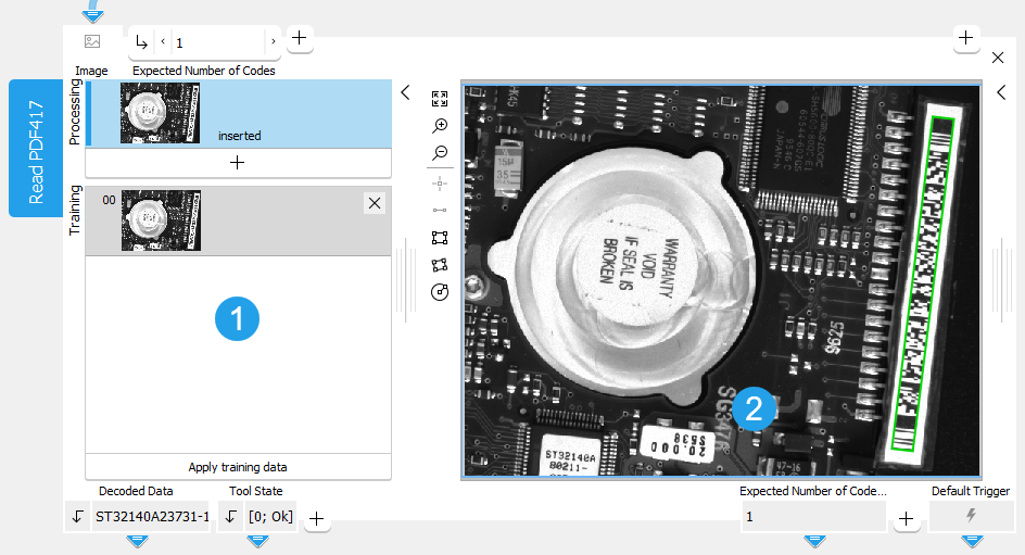 - Click on the "Apply training data" button to perform the training. The parameters for the set of training images are automatically determined. In addition, the tool automatically switches to the processing mode and shows the detected codes in the current image.