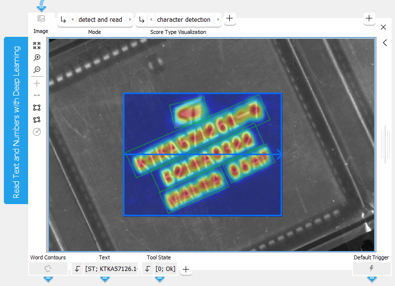 In contrast to the existing MERLIC tool Read Text and Numbers, this tool uses a holistic deep-learning-based approach for optical character recognition (OCR). It localizes characters more robustly regardless of their position, orientation, and font type. Characters are automatically grouped which allows the identification of whole words. Due to this, misinterpretation of characters with similar appearances can be avoided and the reading performance increases.