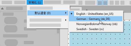 - 单击 Designer 菜单条目“本地化”,然后选择“默认语言”以显示 Frontend 的可用语言列表。该列表包含通过菜单条目“本地化 → 选择语言...”为 Frontend 选定的所有语言。
