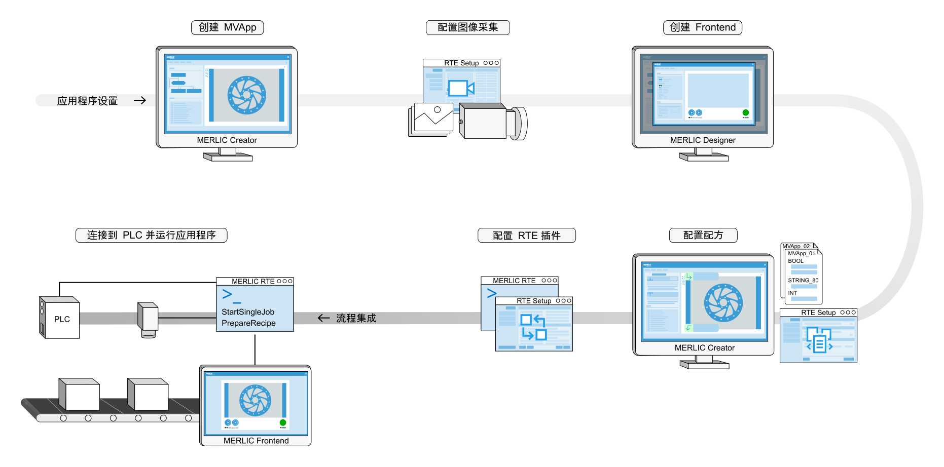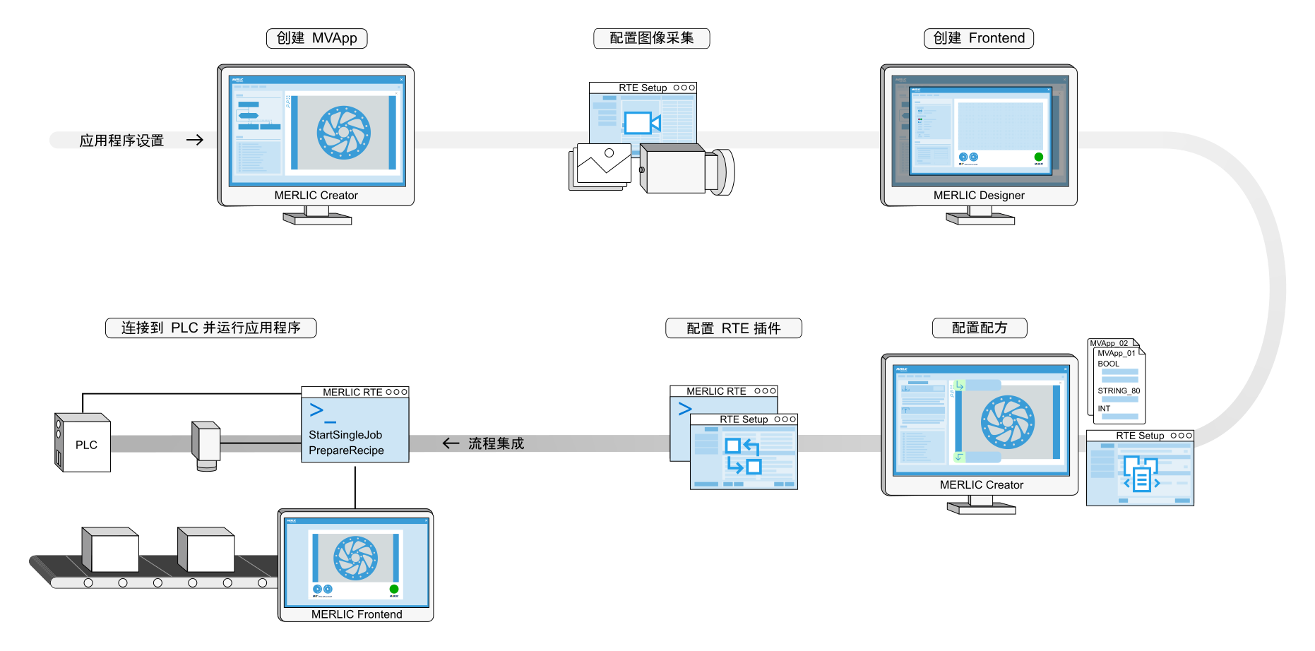 MERLIC 提供了多个组件,用于采集图像、创建视觉应用程序、设计和启动 Frontend,以及将您的应用程序集成到制造机器中。下图显示了具有所提供 MERLIC 组件的典型开发过程的概览。