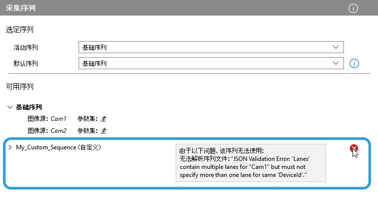 如果在测试自定义采集序列时遇到任何问题,可以查看以下信息。这些信息描述了一些错误原因,可能有助于您解决问题。
