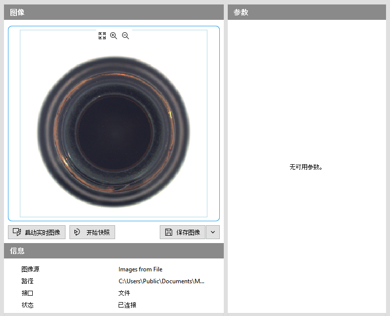 您可以使用图像预览来检查相应图像文件目录中提供的图像。为此,您可以采集图像、放大和缩小图像以进行进一步检查,还可以保存当前显示的图像。