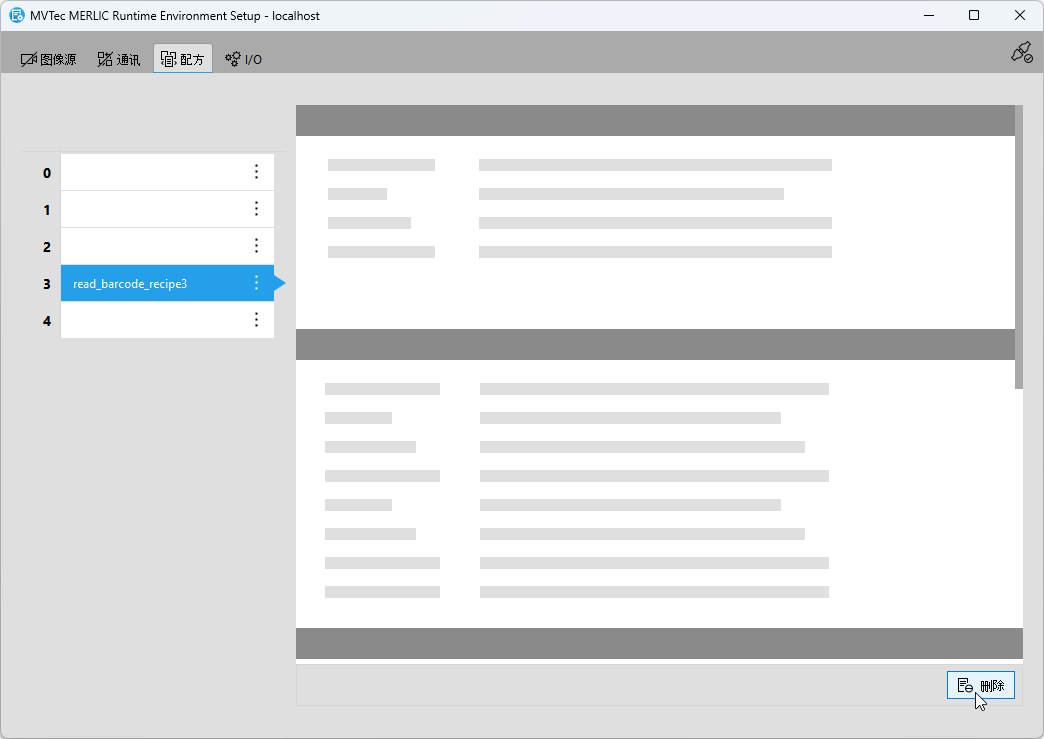 如果不再需要特定的配方,则可以从 MERLIC RTE Setup 中将其删除。您可以随时重新导入配方。