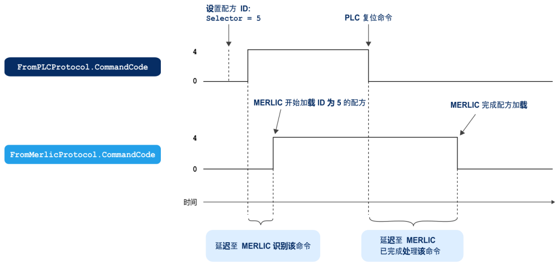 当 MERLIC 识别该命令后,协议 FromMerlicProtocol 中的成员 CommandCode 也将设置为 4,作为 PLC 的确认,并且 MERLIC 开始使用指定的配方 ID 加载配方文件,同时也加载配方中引用的 MVApp。PLC 从 MERLIC 收到命令已被识别的确认后,FromPLCProtocol 中的成员 CommandCode 会设置为 0,以完成握手流程。配方加载后,MERLIC 检查 PLC 发来了哪个 CommandCode 并相应地进行处理。