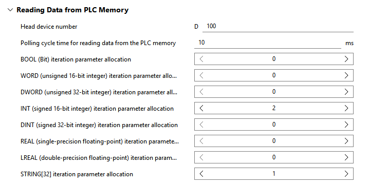 默认情况下,PLC 没有可供配置的迭代参数。因此,您首先必须相应地调整此类别中的参数,并为每种数据类型设置所需的迭代参数数量。