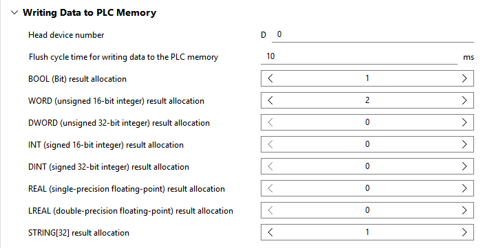 使用“Writing Data to PLC Memory”部分中相应参数 Head device number 的默认设置,有 100 个devices可用于插件写入协议的值区块。然而,这些并非在所有用例中都足够。例如,如果在执行 MVApp 时要传输大量结果,并且这些结果需要内存上的超过 100 个devices,则必须增加此类别“Reading Data from PLC Memory”中的“Head device number”。否则,由插件写入的区块和由 PLC 写入的区块将重叠,因为它们会尝试写入相同的地址。 为防止出现这种情况,如果“Reading Data from PLC Memory”中的“Head device number”设置得太低,MERLIC RTE Setup 会显示错误。