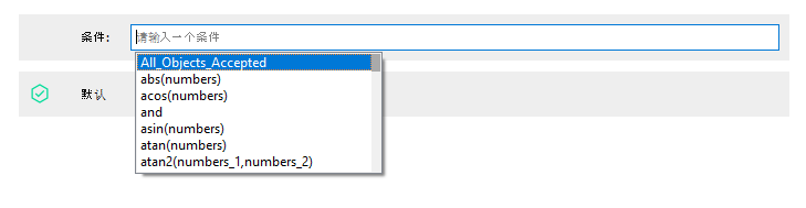 此工具不显示图形窗口,而是显示可在其中定义条件的输入字段。在条件输入字段中键入时,会弹出一个自动完成列表,其中包含与输入内容匹配的可能函数和运算符。该列表还包含手动添加的参数和以前定义的结果。