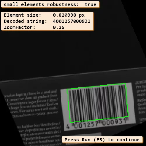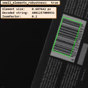 To activate the feature, the parameter 'small_elements_robustness' has to be set to 'true', which is the default value. Additionally, 'element_size_min' has to be set to a value smaller than 2.0 (via set_bar_code_param, values between 0.6 and 2.0 are possible for this feature).