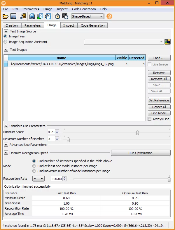 In conclusion, it's possible to find an optimal set of MinScore and Greediness in terms of tradeoff between detection rate and speed. For this task, HDevelop's matching assistant can be a suitable option (see screenshot). Further information on speedup vs. robustness and advanced parameters can be found in this tutorial video.