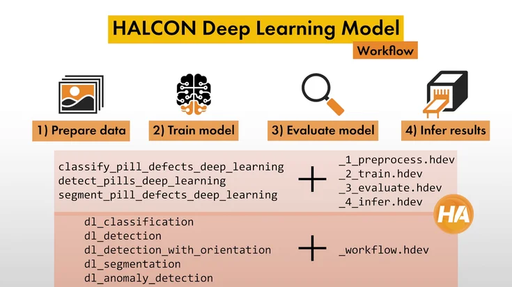 Train custom CNNs in HALCON for classification, detection, and segmentation, then deploy to analyze new images.