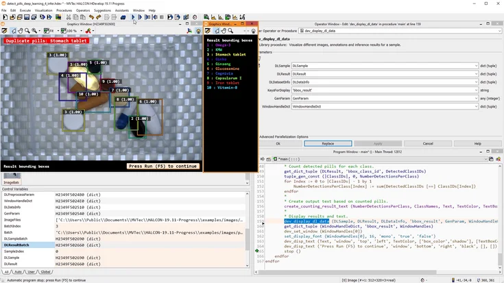Learn HDevelop essentials: Graphics, Program, Operator, Variable windows, plus step-through debugging with counter and breakpoints.