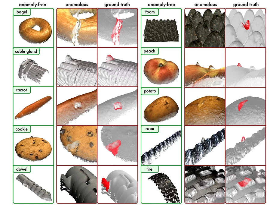 Paul Bergmann, David Sattlegger, Carsten Steger: The MVTec 3D-AD Dataset for Unsupervised 3D Anomaly Detection and Localization; in: Proceedings of the 17th International Joint Conference on Computer Vision, Imaging and Computer Graphics Theory and Applications - Volume 5: VISAPP, 202-213, 2022, DOI: 10.5220/0010865000003124.