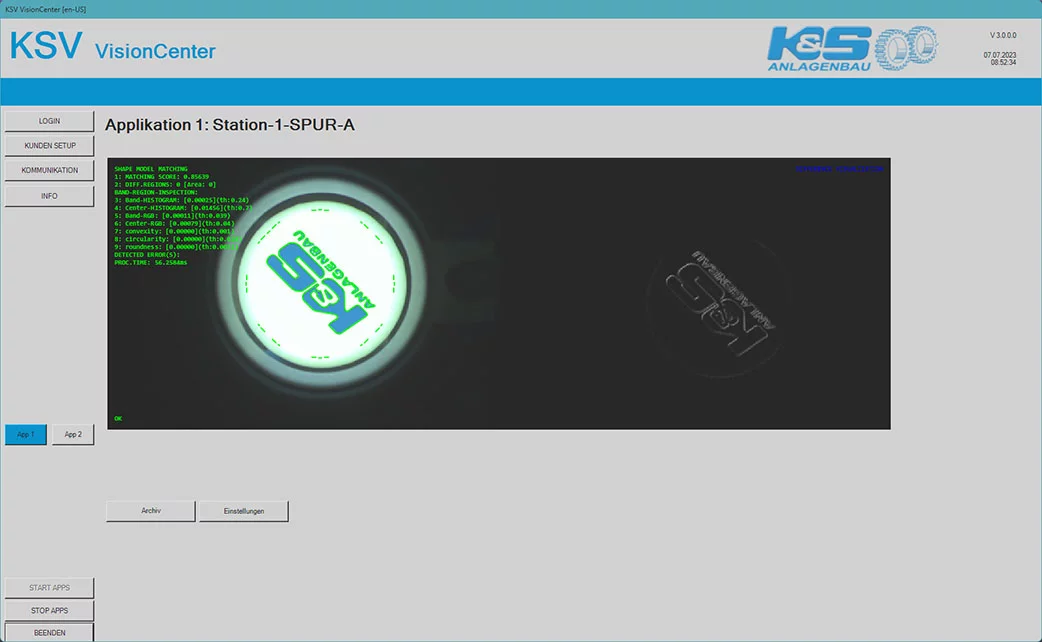 Another core component is MVTec HALCON. HALCON is integrated into the K&S Control software using HDevEngine. "HALCON is the industry standard in the field of image processing software and is not limited to just a few algorithms," explains Dr. Heber. HDevEngine acts as an interpreter designed to dynamically load and execute the machine vision algorithms. It also enables changes to the machine vision processes "on the fly" without having to recompile or recertify the entire application. Furthermore, HDevEngine communicates with the GUI in the background. Operators of the system have little or no contact with it. This is because they operate the system via the GUI they are familiar with.