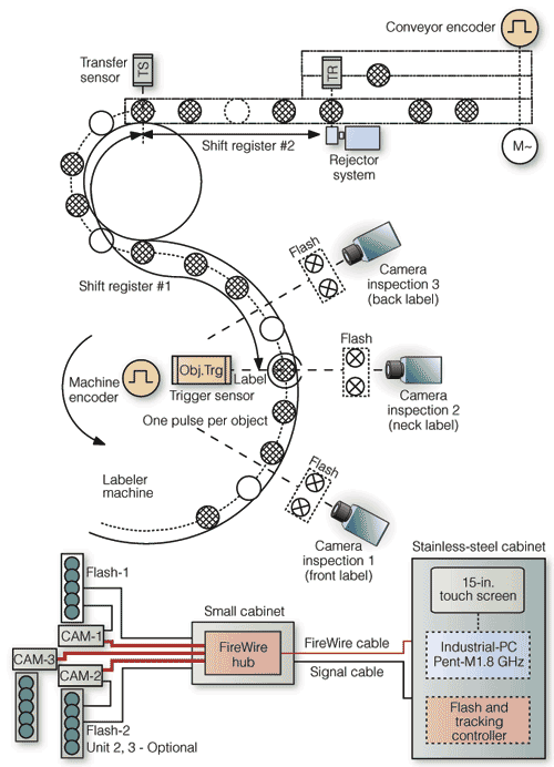 The system must control labels on the front, the backside, and at the bottle's neck. It checks the labels' fit, reads the expiration date, appraises the quality of captions, detects scratches, controls graphic elements as logos, and discovers dog-ears. Naturally, bar codes and data matrix codes must be identified and read neutrally against rotation and position.