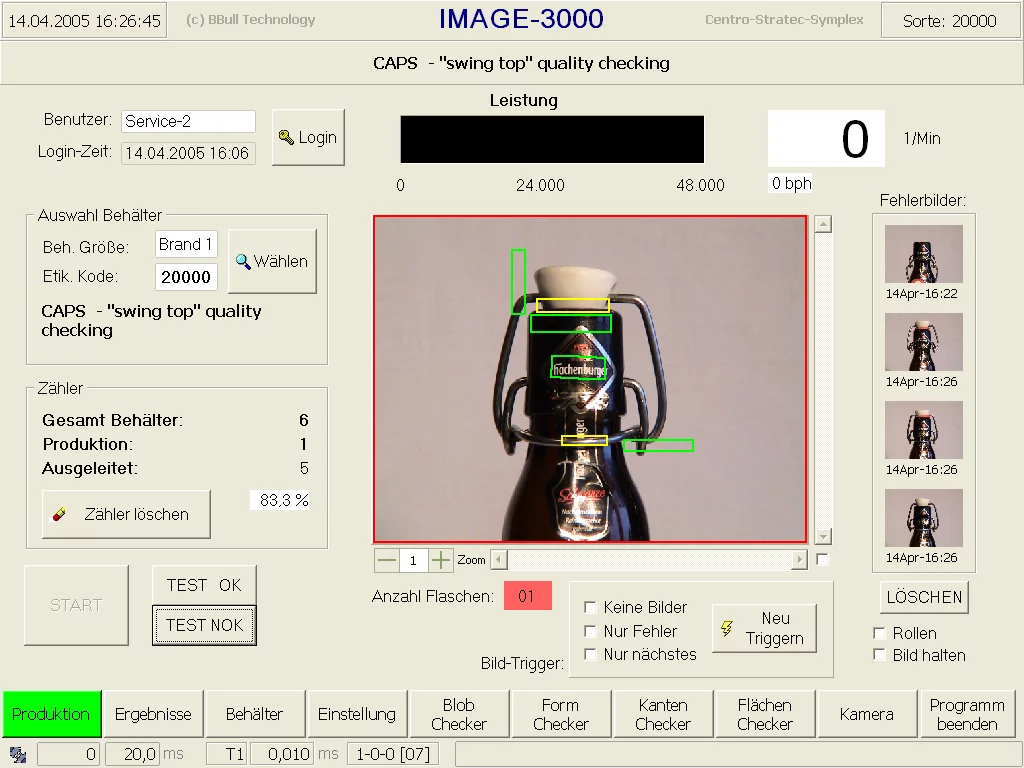To operate this enormous amount of containers, the machine vision application must acquire and process four camera images in parallel running on a single PC. Furthermore, the system supports other complex tasks. BBull has developed a procedure to control swing cap bottles. This someway nostalgic manner to cap beer bottles currently undergoes an irresistible renaissance. However, to control the swing caps and labels of these bottles is a complex challenge. The metal bails must be in the right position, cap and packing ring adjusted, the seal label undamaged, and defilements or damages in the aperture area must be discovered. Moreover, before the packing process the barrels must be checked for completeness. All these control tasks are mastered by the STRATEC BV 3000W in highest speed.